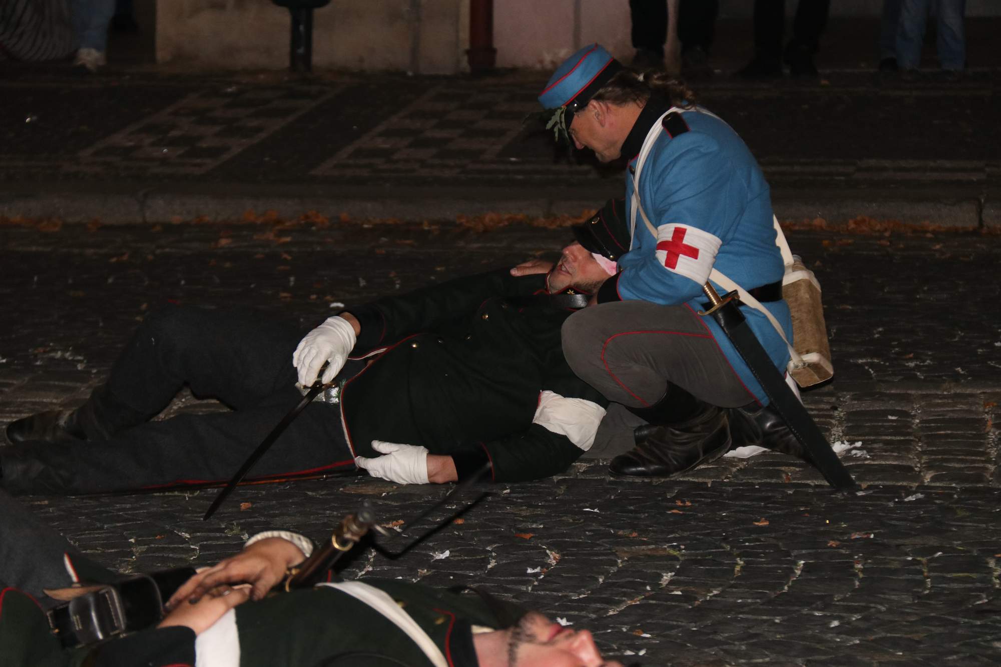 Následně se vojsko přesunulo na Valdštejnovo náměstí, kde byla připravena bitevní ukázka. Protože v Jičíně se historicky bojovalo v nočních hodinách, proto i ukázka probíhala po 20. hodině. Veřejnost zde mohla sledovat útok Prusů z nynější Palackého ulice, kterou Prusové útočili v roce 1866. Na náměstí bylo přítomno i dělostřelectvo, saští myslivci a velký oddíl rakouské pěchoty. Diváci si zde mohli užít jedinečnou atmosféru noční bitevní ukázky a sledovat rozdílnou taktiku jednotlivých armád.