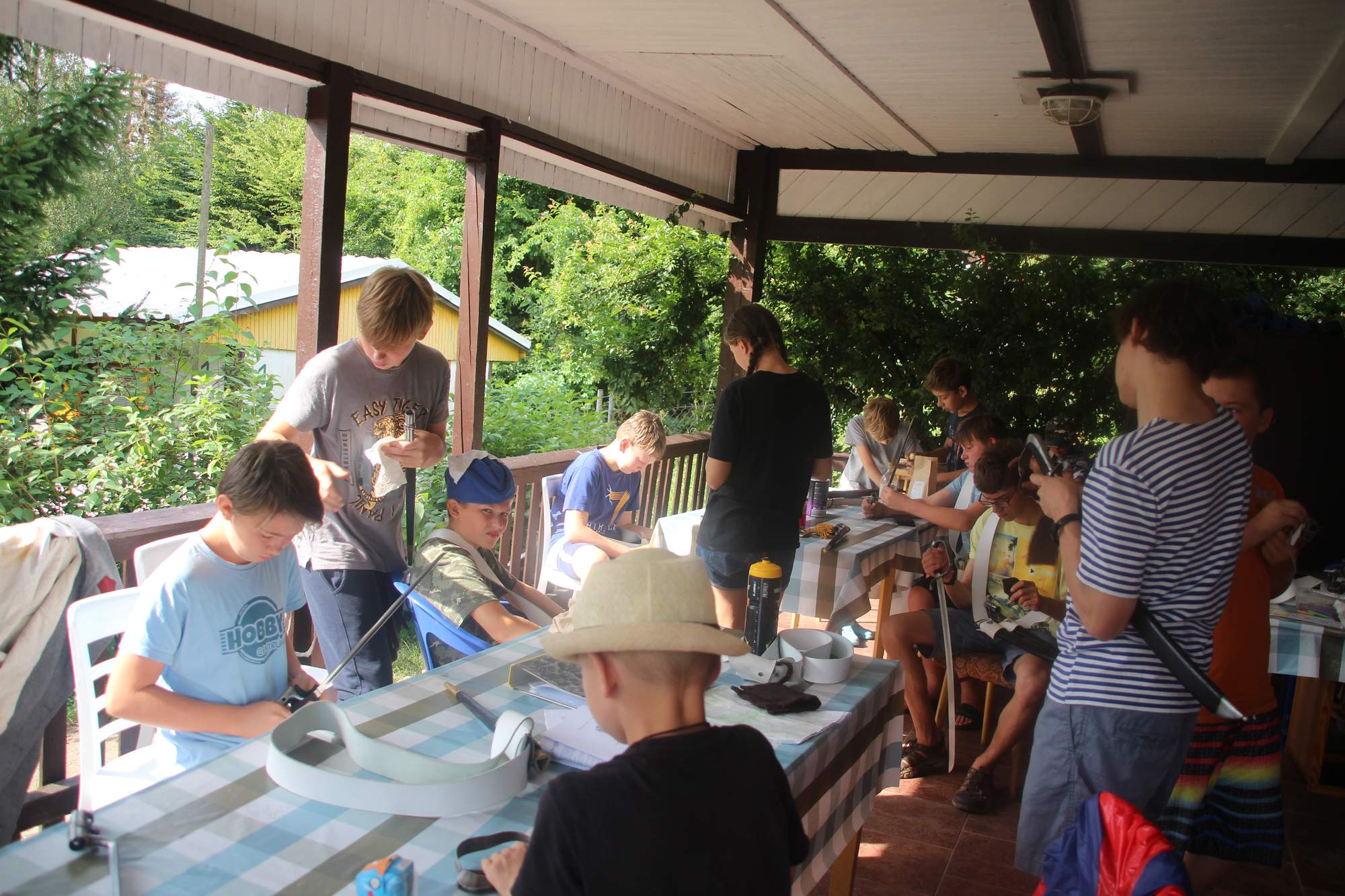 V úterý jsme měli hodně deštivo, proto dopoledne začalo ukázkami výzbroje a výstroje, se kterými se děti naučily zacházet.. Novinkou bylo vydání nových zbraní, které byly v letošním roce pořízeny díky projektu Královéhradeckého kraje a nadačního fondu Tesco. Jednalo se o bajonety včetně řemení, aby šly bezpečně nosit na uniformě. Děti se dozvěděly jaká jsou pravidla bezpečnosti práce s těmito zbraněmi a že se z pouzdra smí vyndat pouze na rozkaz velitele. Vzhledem k tomu, že těchto bajonetů je celkem devět, velitelé čet si určí kadety, kteří se umí náležitě chovat a ovládají zbraň a pouze ti budou moci bajonet nosit. Děti si mohly vyzkoušet i práci s vybavením nosiče raněných, tesaře, bubeníka a dokonce i praporečníka.